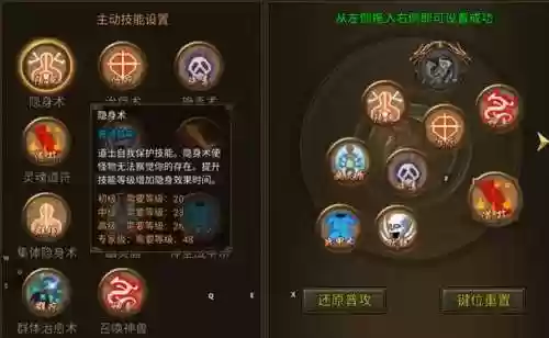 灵魂道符。以灵魂为引召唤符箓远程攻击单体敌人。 施毒术。对敌方单体施放持续损血的中毒效果,并且在中毒效果持续时间降低其物理和魔法防御。 骷髅召唤术。从地狱召唤一只骷髅帮助自己作战,技能等级越高骷髅属性越强。 集体隐身术。将范围内人类的气息隐藏,令怪物无法发觉其存在。